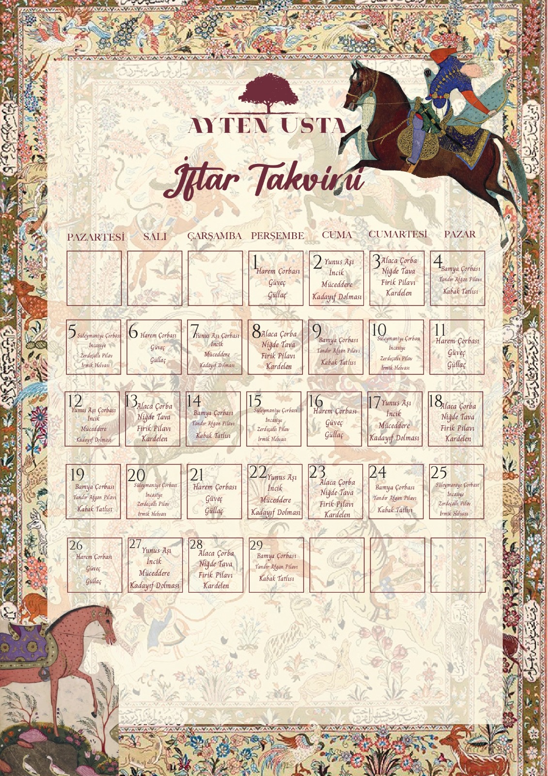 Menülere ait görseller yukarıdadır, Her gün menülerden sadece 1 tanesi çıkmaktadır. Günün menüsü, fiyat bilgisi ve rezervasyon için lütfen Ramazan takvimine bakabilir veya iletişime geçebilirsiniz. İftariyelikler Menülerle birlikte sunulmaktadır.